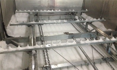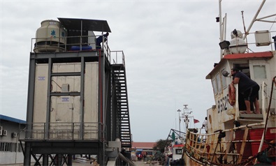 莫桑比克40噸40噸片冰耙式自動儲冰系統(tǒng)用于遠航捕撈保鮮供冰。客戶是當?shù)刈畲蟮膹氖逻h洋捕撈的公司之一,因為增加了更多的船只,所以他們需要更多的冰。因此,他們購買20噸集裝箱式片冰機和40噸儲冰耙式輸出系統(tǒng)。該系統(tǒng)直接安裝在港口岸邊,船只靠岸后,可通過稱重螺桿系統(tǒng),自動稱重出冰,所有過程無需人工手動操作,全部由自動控制系統(tǒng)完成,實現(xiàn)了高度自動化。