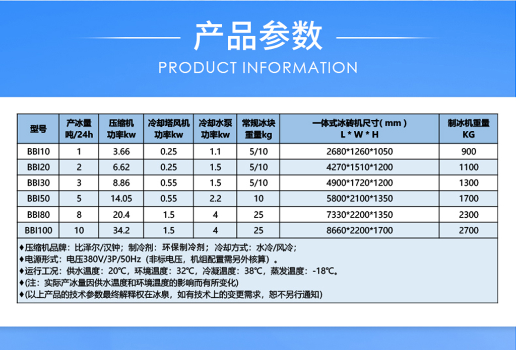 廣州冰泉是大型氟制冷冰磚機(jī)行業(yè)開(kāi)拓者,研發(fā)制造的全球第一臺(tái)日產(chǎn)冰量100噸的大型氟制冷冰磚機(jī)2010年在馬來(lái)西亞成功運(yùn)行?,F(xiàn)單臺(tái)(套)設(shè)備日產(chǎn)冰量從1噸~200噸,可以滿足不同客戶需求。