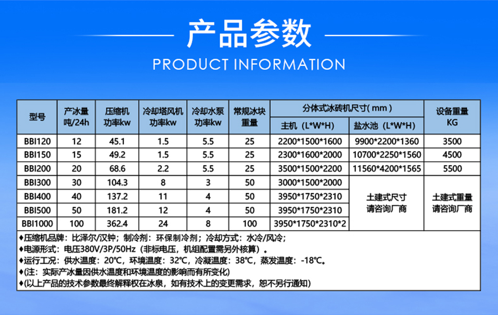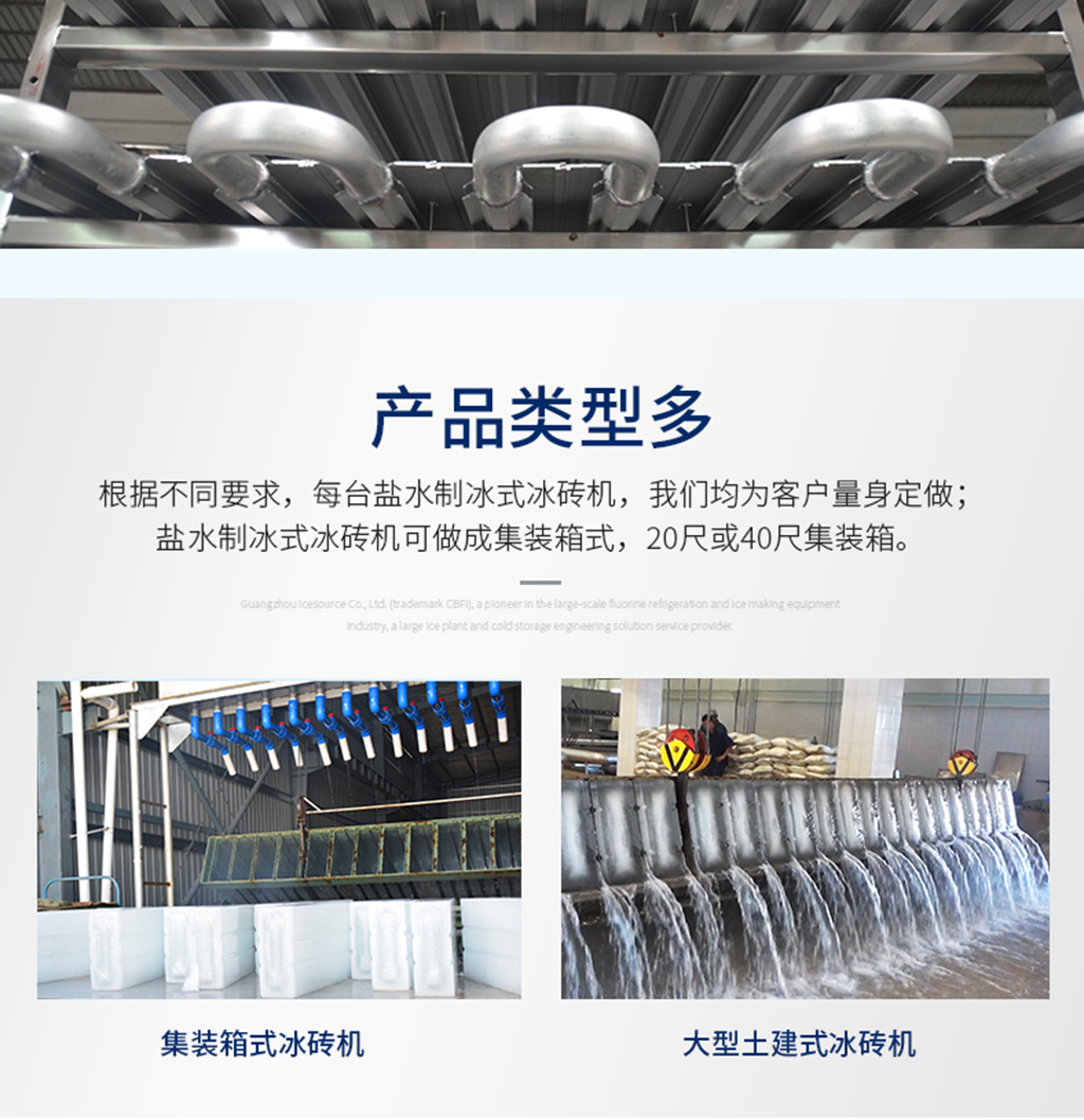 廣州冰泉是大型氟制冷冰磚機行業(yè)開拓者,研發(fā)制造的全球第一臺日產(chǎn)冰量100噸的大型氟制冷冰磚機2010年在馬來西亞成功運行?,F(xiàn)單臺(套)設備日產(chǎn)冰量從1噸~200噸,可以滿足不同客戶需求。
