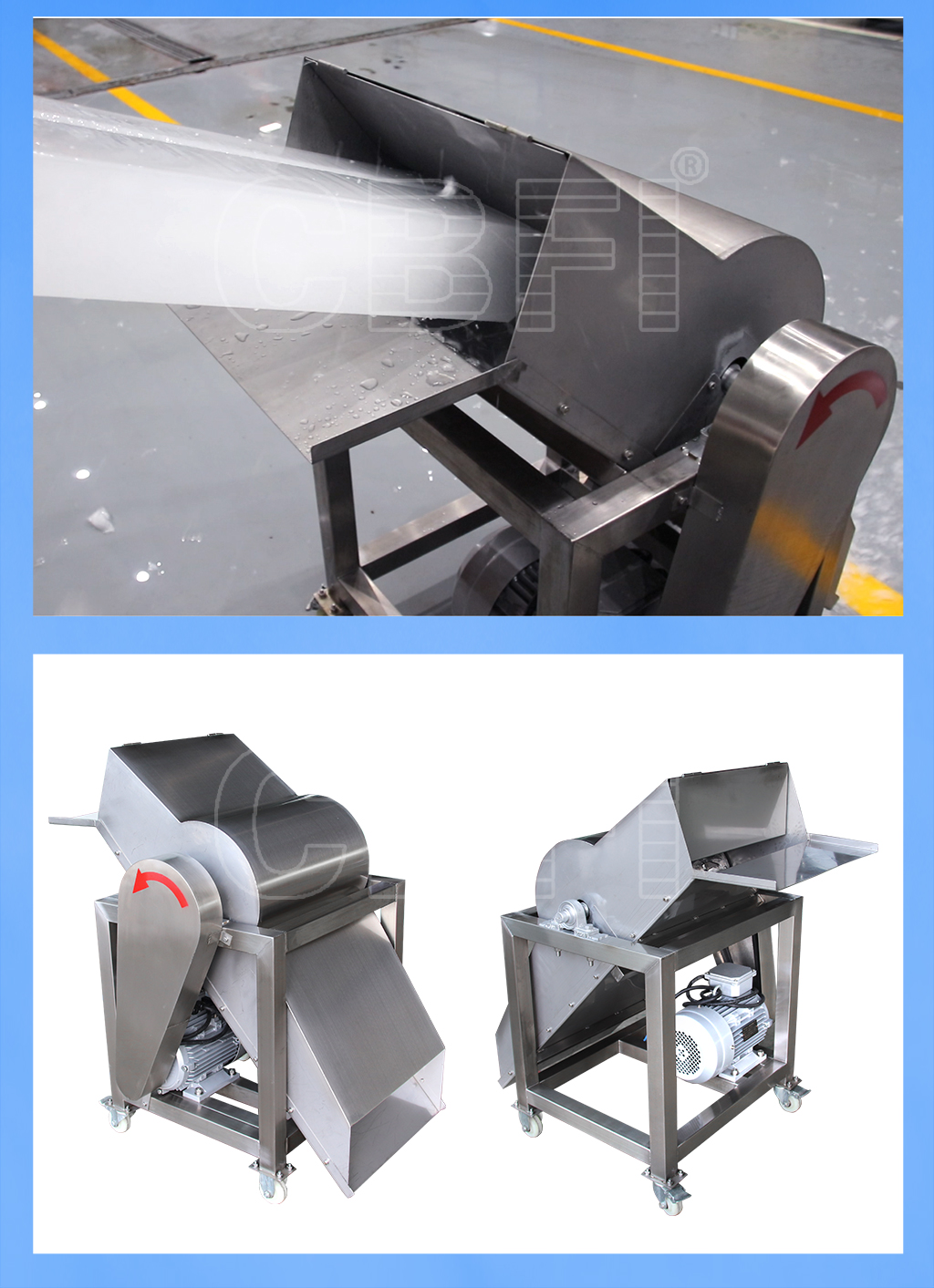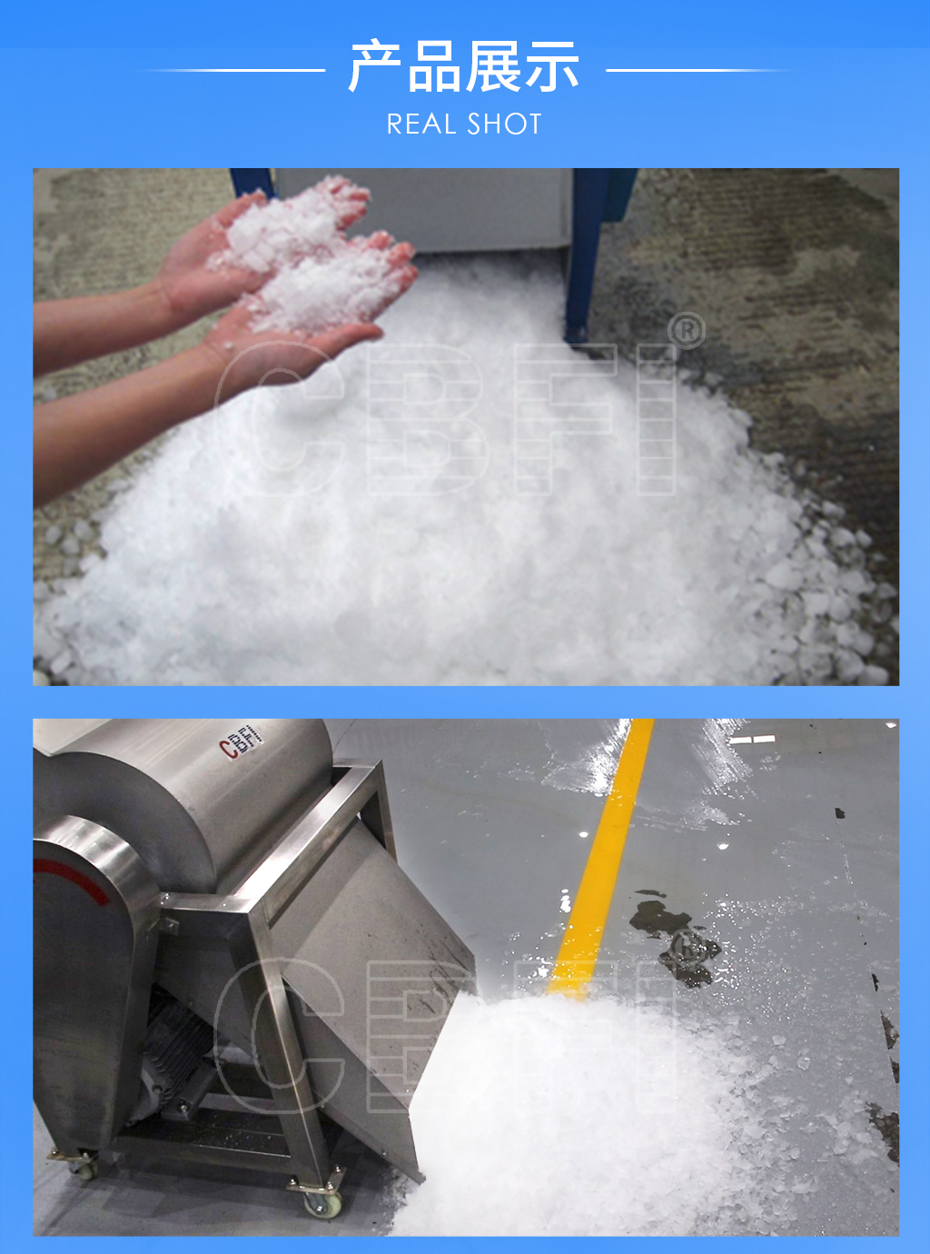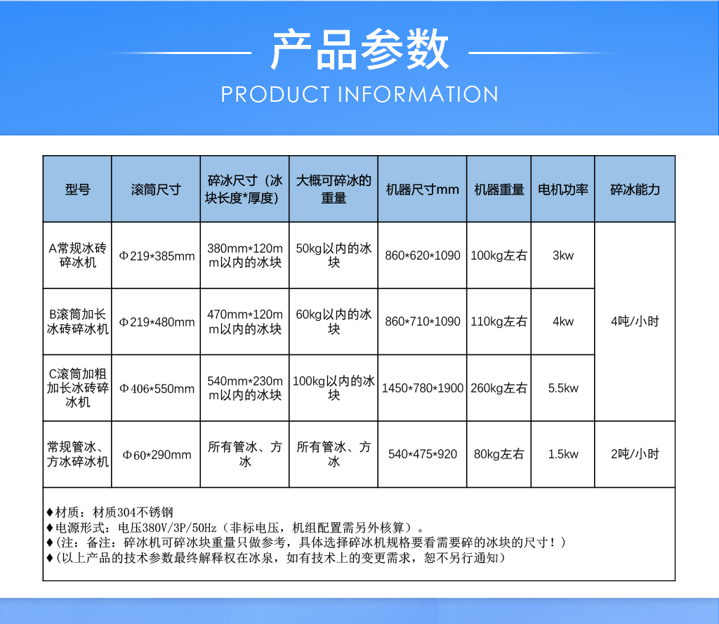 碎冰機(jī)有多種規(guī)格的機(jī)型,針對(duì)冰磚機(jī)不同冰模而設(shè)計(jì)。冰磚機(jī)冰模有:2.5kg、5kg、10kg、15kg、20kg、30kg、50kg、100kg等。